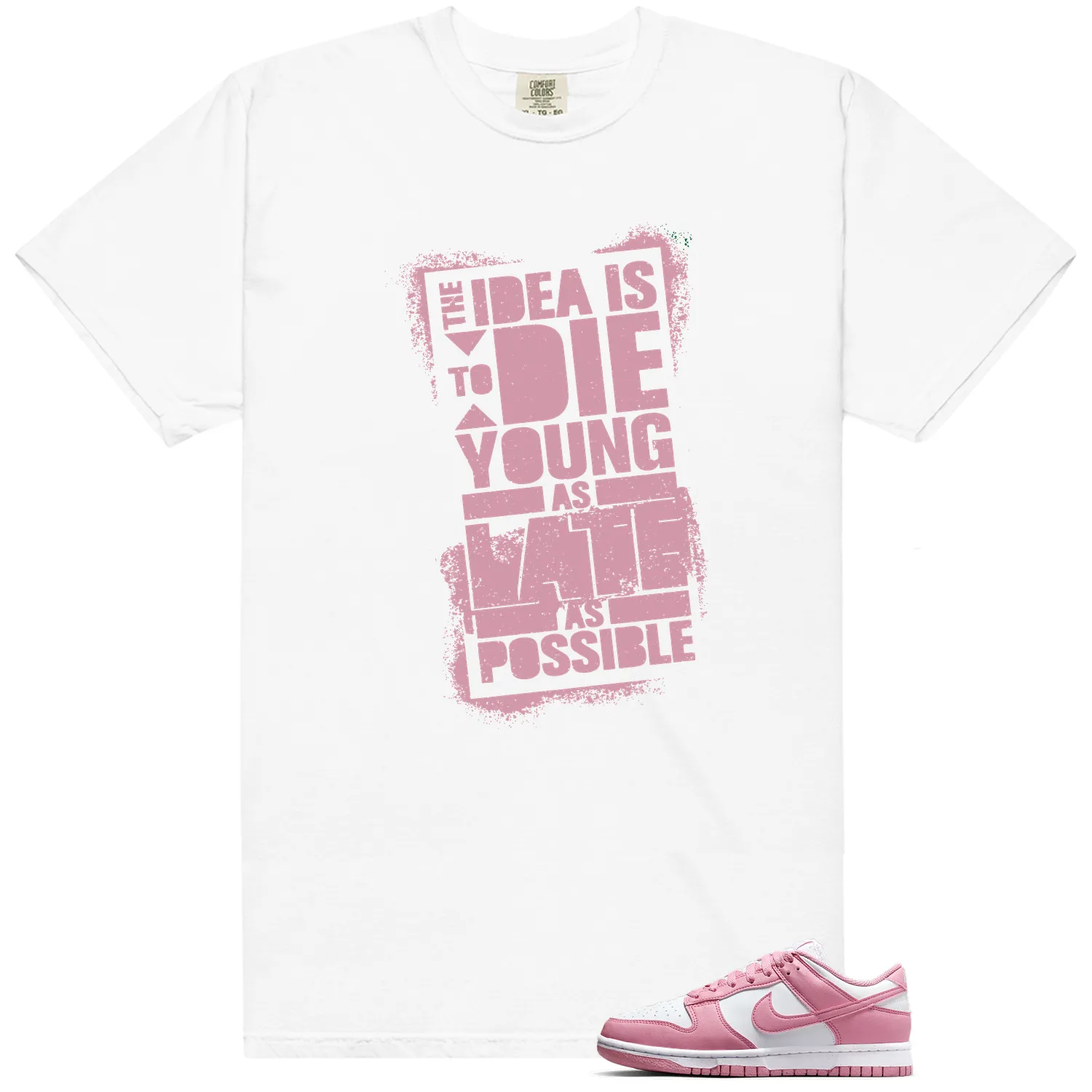 The perfect sneaker shirt to match your Dunk Low Next Nature Elemental Pink. LitGoat Clothing – Die Young Sneaker Tee. Complete your fit.